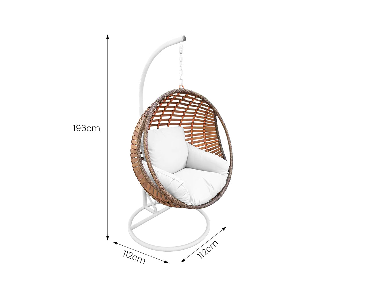 Create a cozy retreat with this stylish hanging wicker swing chair. Designed for comfort and durability, it features a sturdy aluminium alloy frame wrapped in weather-resistant PE rattan. A soft, all-weather cushion in light grey adds extra comfort, while the strong iron base ensures stability.