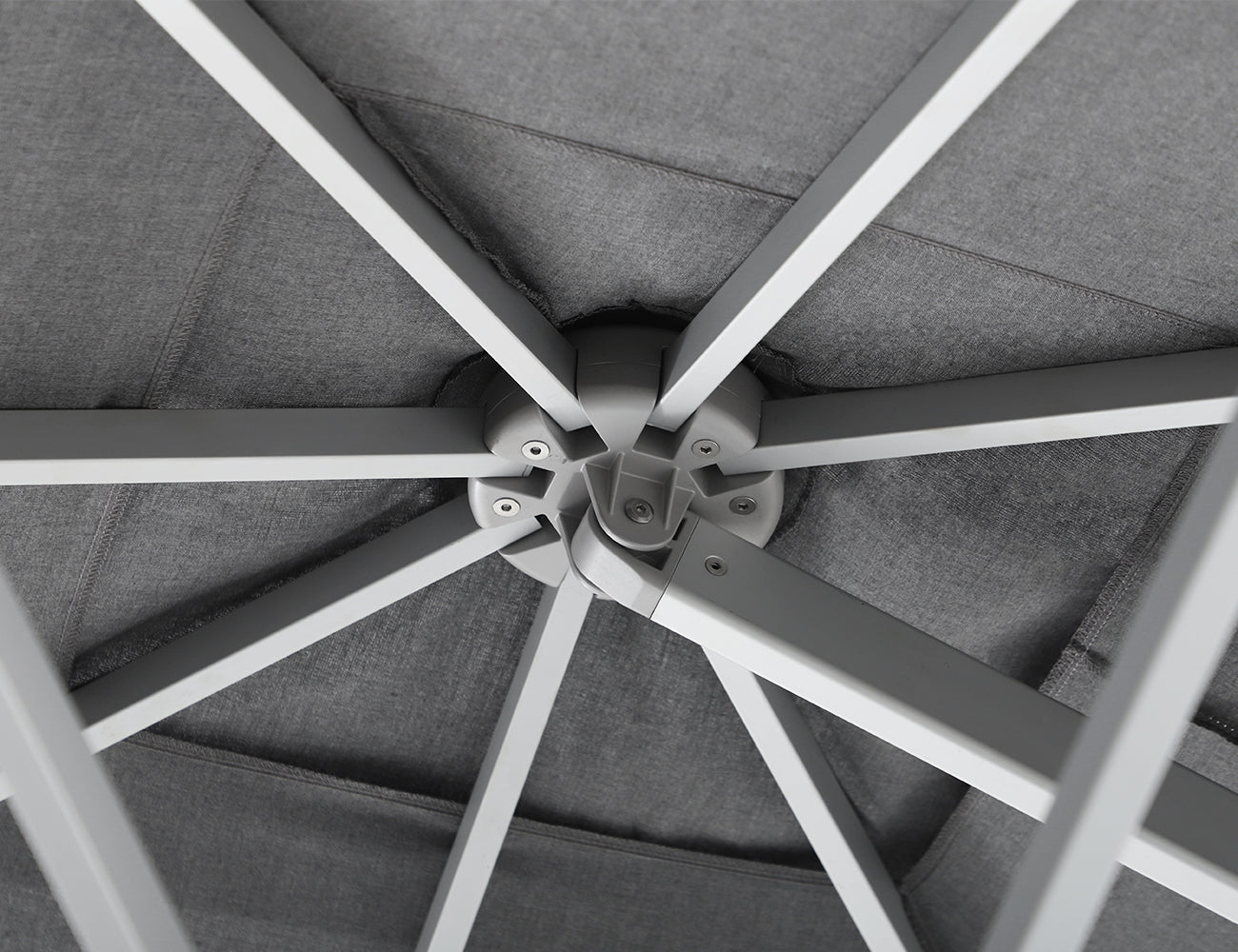 Built with a sleek matte aluminum frame and premium Sunbrella fabric, Tecra is made to endure. It shrugs off sun, wind, and fading, all while keeping its elegant look season after season. The umbrella also rotates 360°, letting you follow—or avoid—the sun with a quick adjustment. A protective cover is included to keep it looking its best between uses.