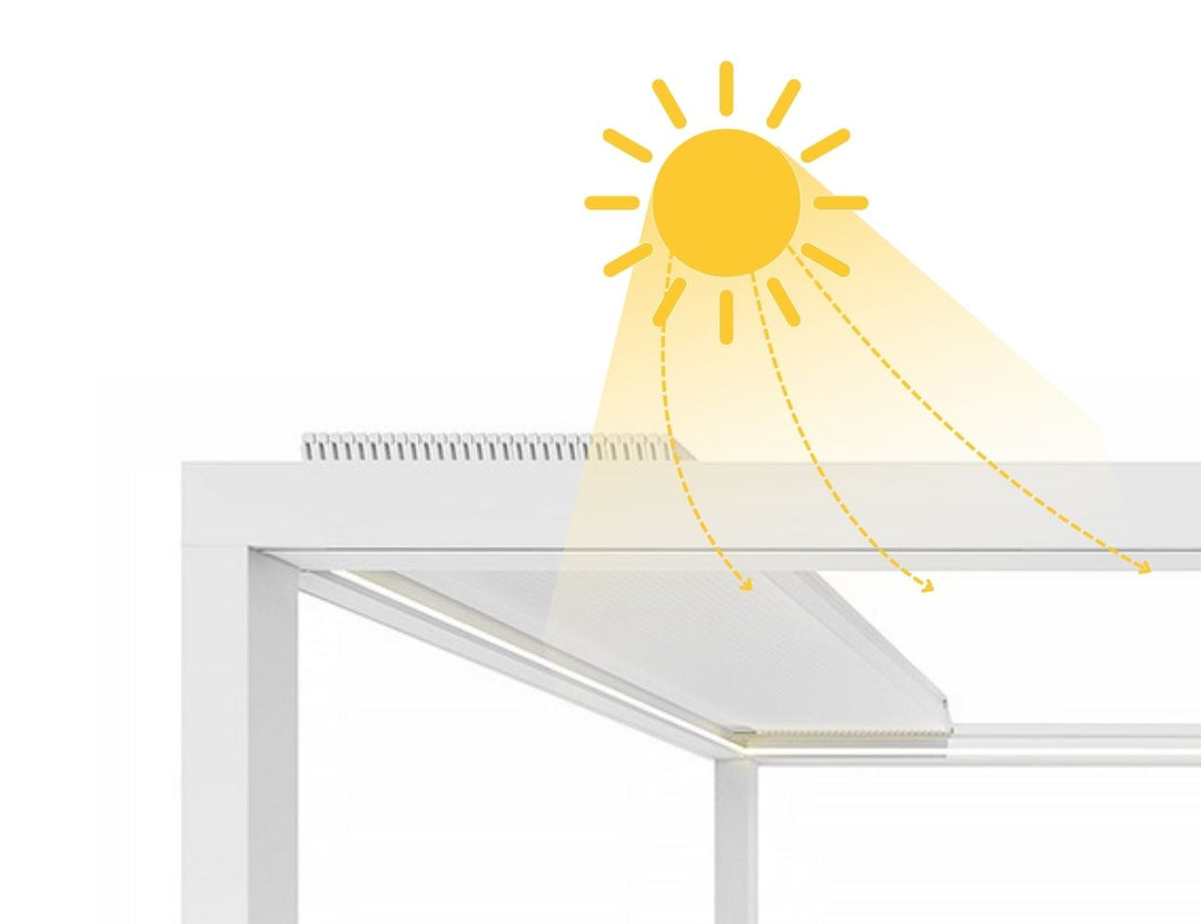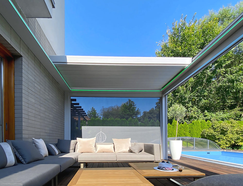 Crafted from durable, weather-resistant aluminium, the slim, modern blades provide strength with a load-bearing capacity of 120 kg/m², ensuring long-lasting performance and reliability. Integrated RGB strip lighting along the gutters adds subtle, customisable illumination, perfect for evenings and entertaining.