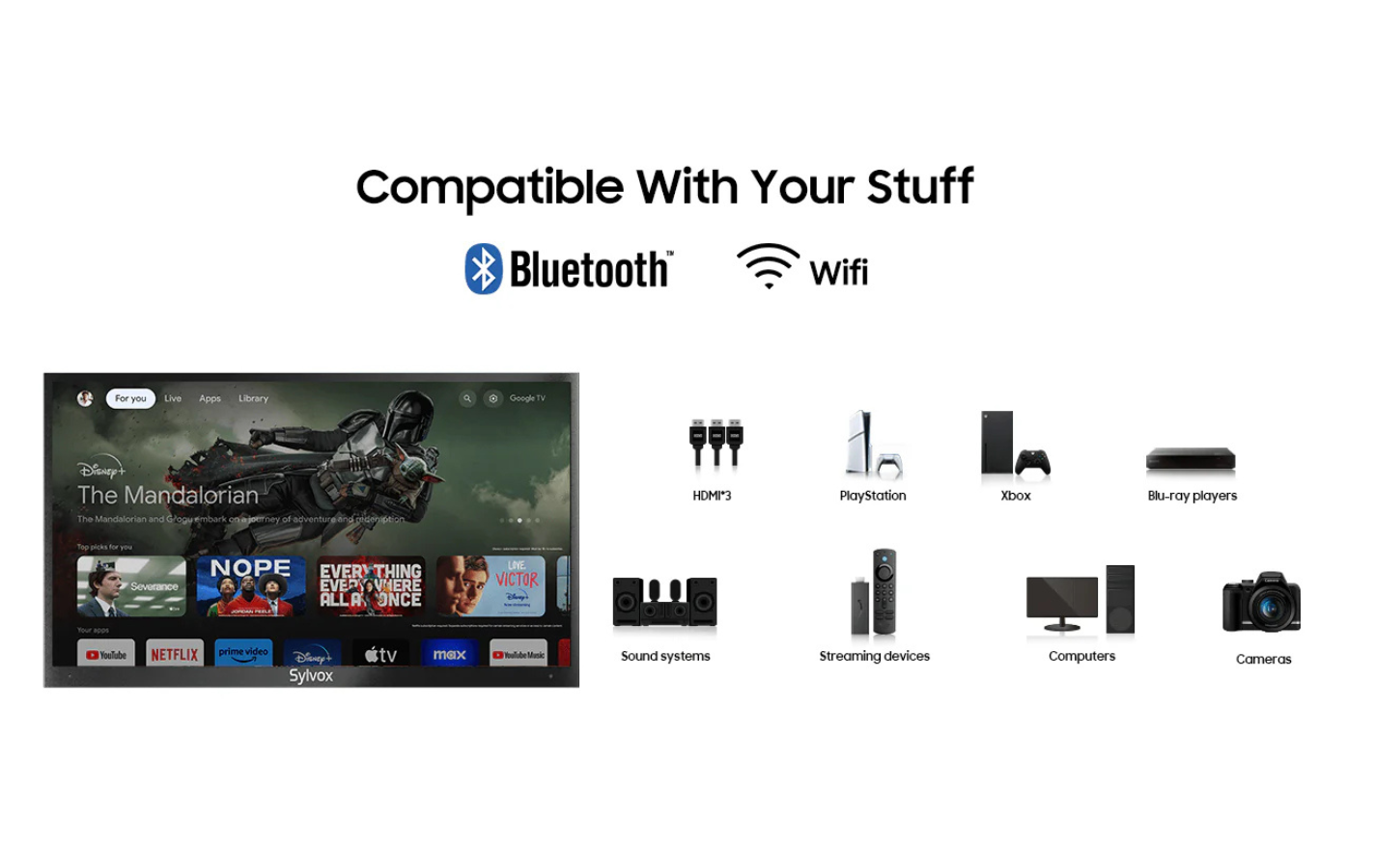 - Sylvox Outdoor TV: Built-in Google Assistant and voice control for easy navigation.